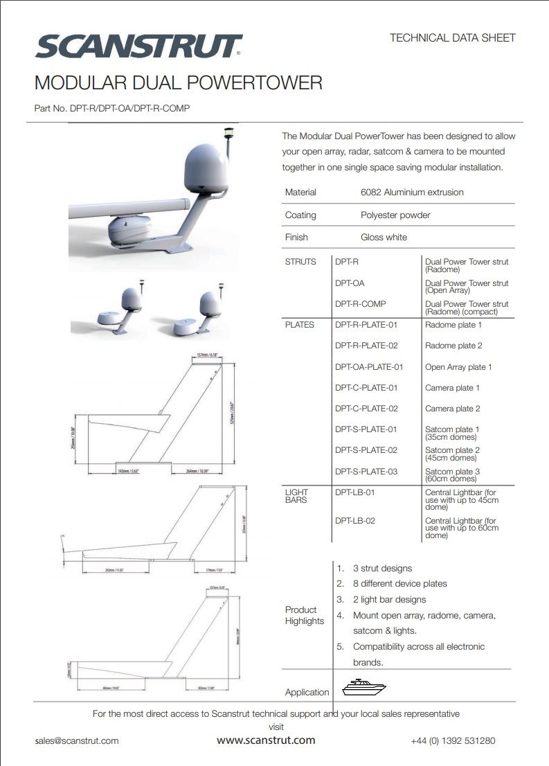 The Scanstrut Modular Dual PowerTower has been designed to allow your open array or radome, Satcom & camera to be mounted together in one single space-saving modular installation, providing a clear view of the horizon for maximum antenna performance. Its aerodynamic shape and high gloss finish create a product that is as strong as it is attractive.