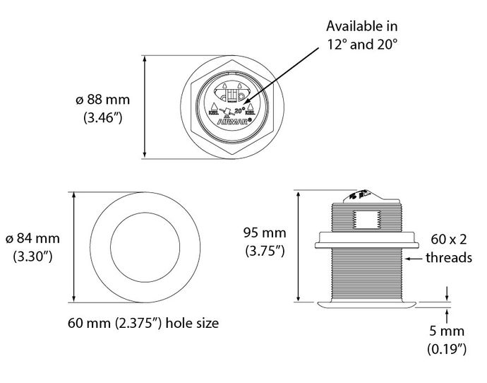 The B60 is a 600 W, 50/200 kHz transducer which integrates Airmar’s popular tilted element feature. Tilted element transducers have the ceramic element fixed at either a 20° or 12° angle within the transducer housing. The transducer is installed almost flush to the hull and the tilted element corrects for the hull deadrise by orienting the beam directly down. This assures maximum echo returns to the transducer and more accurate depth readings.