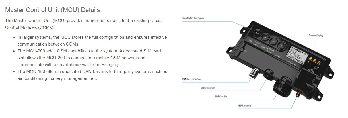 There is a range of different MCU’s available, the MCU-200 and MCU-250 have the added advantage of GSM connectivity which allows the owner remote control of the system as well as TXT notifications in the event of system alarms.