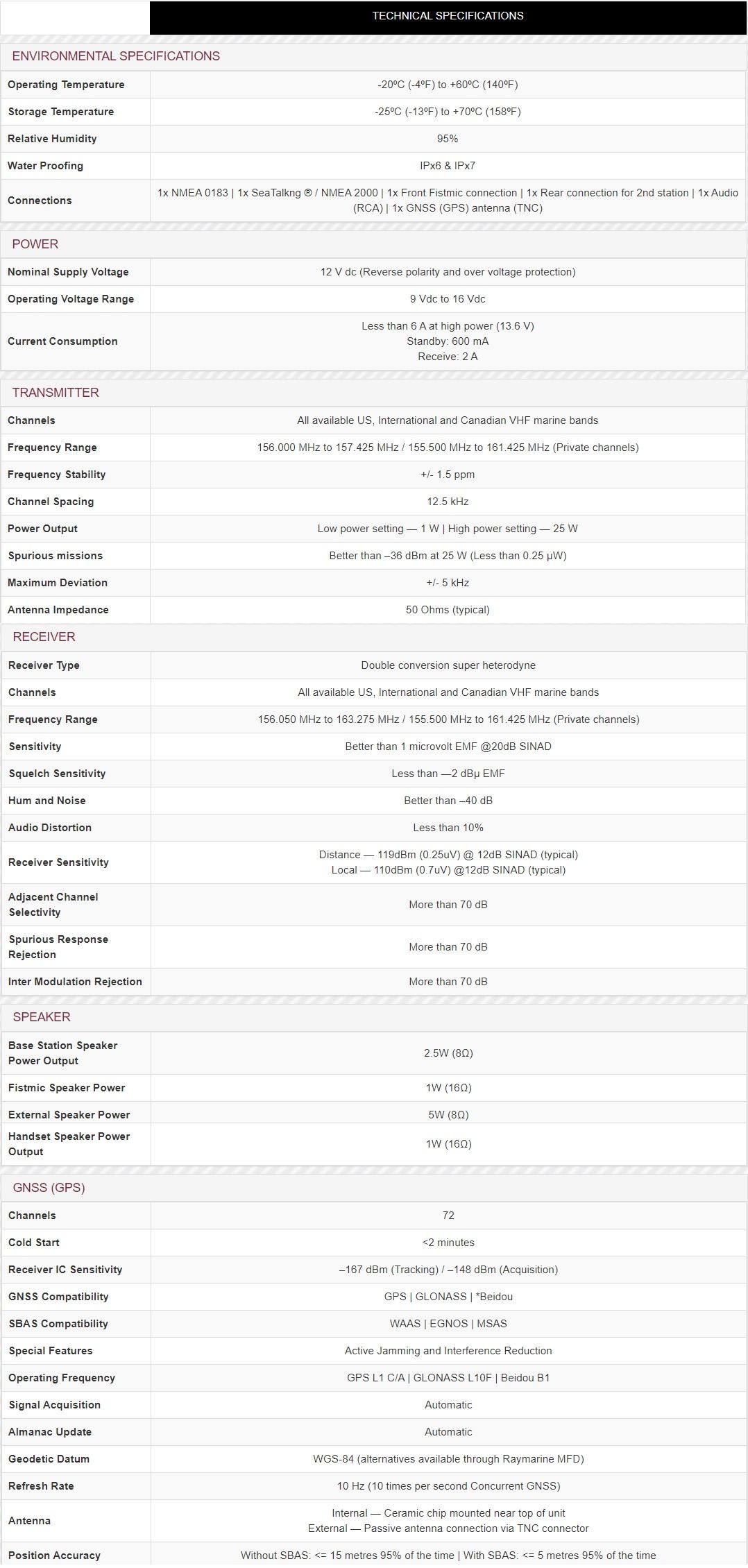Raymarine’s Ray63 radio comes with oversized controls and a big screen for easy operation offshore. Ray63 is a full-function VHF marine radio with Class D Digital Selective Calling (DSC) and a built-in GPS receiver. Simply program your boat's MMSI number into the RAY63 and immediately benefit from the enhanced calling and safety features of DSC. The Ray63 also supports 1 wired or 2 wireless RayMic controllers for true multi-station control and intercom capability.
