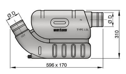 Vetus extra large Waterlock designed for long, relatively straight exhaust runs. Capacity 16 litres. With fixed (non-rotating) inlet and outlet connections.