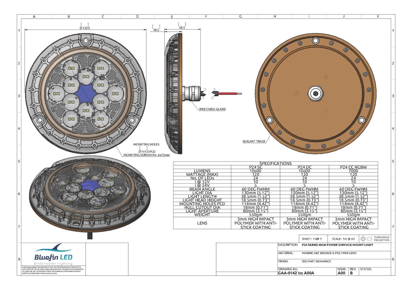 Bluefin Piranha P24 surface mounted LED underwater boat light produces 12,000 12,000 Fixture Lumens (10,000 for the Colour Change model).