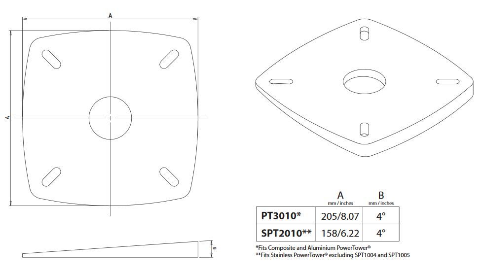 Scanstrut 4° Base Wedge for aluminium and composite PowerTower designed to provide a level horizon for your radar when your boat is bow up and on the plane, maximizing the performance of your antenna.