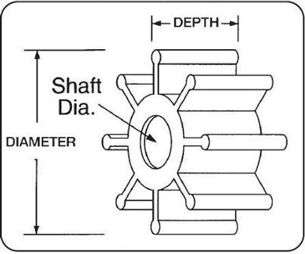 - If you have the impeller in front of you identify the impeller profile Code Letter by going to the Manuals & Resources tab, click on the "Flexible Impeller Replacement Guide" link, go to Selection Table by Profile section. Measure the Depth (see Diagram tab). Identify the Drive. Measure the Shaft Diameter. Select the material. Read off the part number.