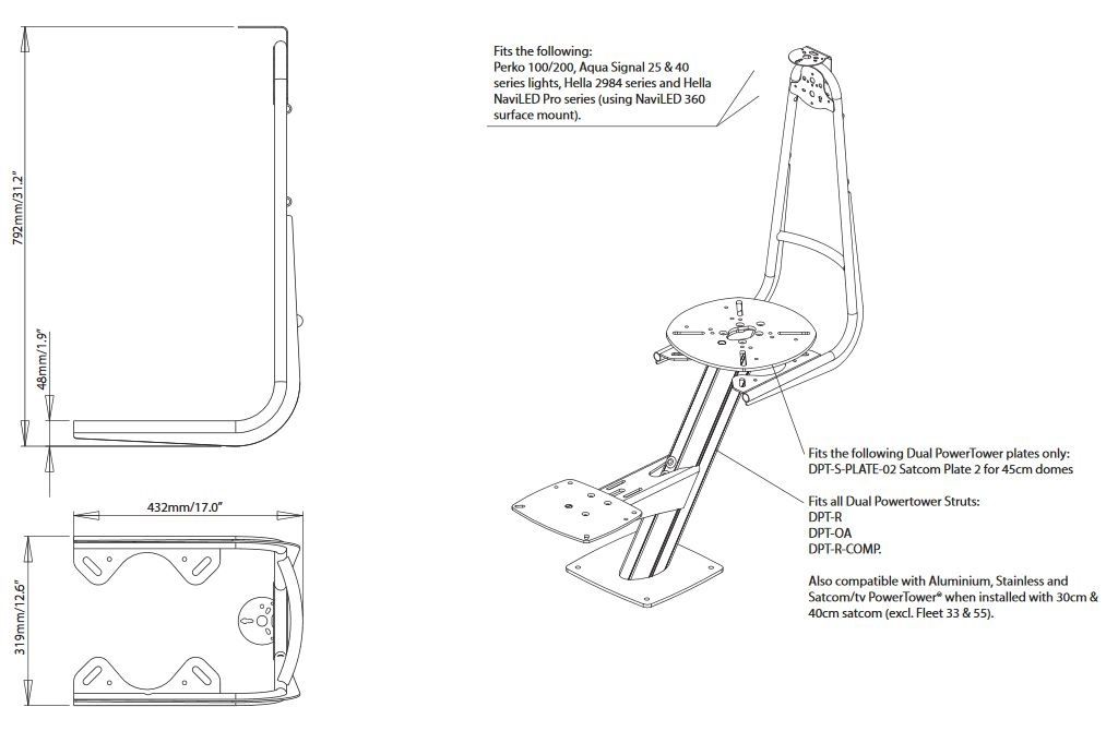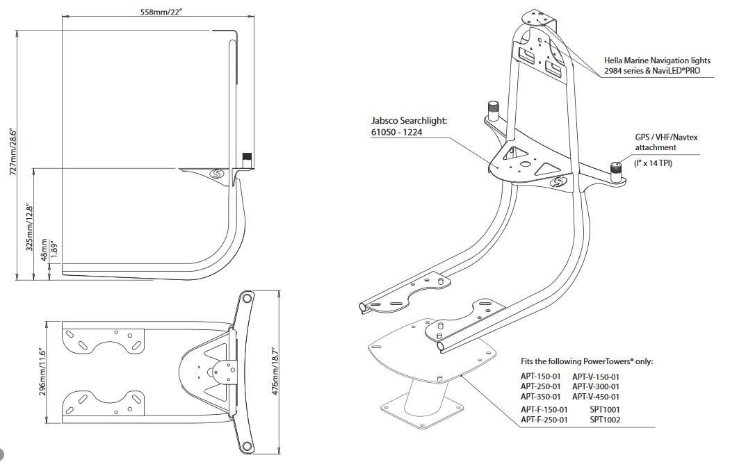 Combined mounting solution for navigation and search lights, GPS and VHF antenna for aluminium and stainless steel PowerTowers.