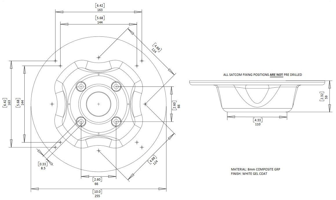 The high strength single piece composite GRP moulding is corrosion free. The satcom fixings are hidden internally and the antenna fixings are external for ease of maintenance. The unit includes factory fitted watertight seals and glands for peace of mind and allows for easy cable connections. It raises the antenna by 80mm.