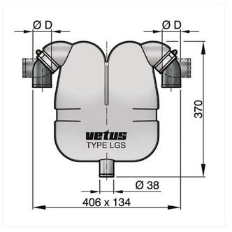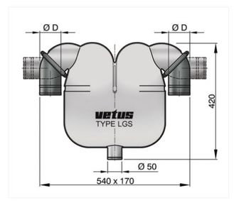 The VETUS gas/water separator for marine engines and generator sets has a double function, it separates the injected raw cooling water from the exhaust gases and also functions as a gooseneck, providing an excellent sound attenuation so it no longer produces disturbing gurgling exhaust noises.