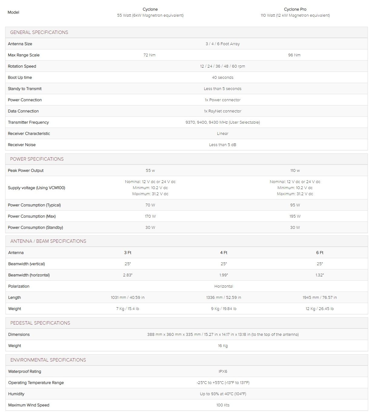 Cyclone radars are available in 3, 4 or 6 foot array spans and two high-power output options of 55W or 110W peak power output.
