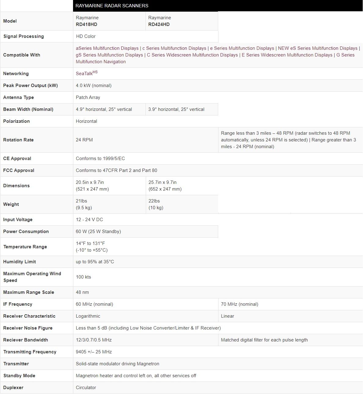 RD418HD: 18 Radome: 4.9° horizontal, 25° vertical - 20.5in x 9.7in (521 x 247 mm)