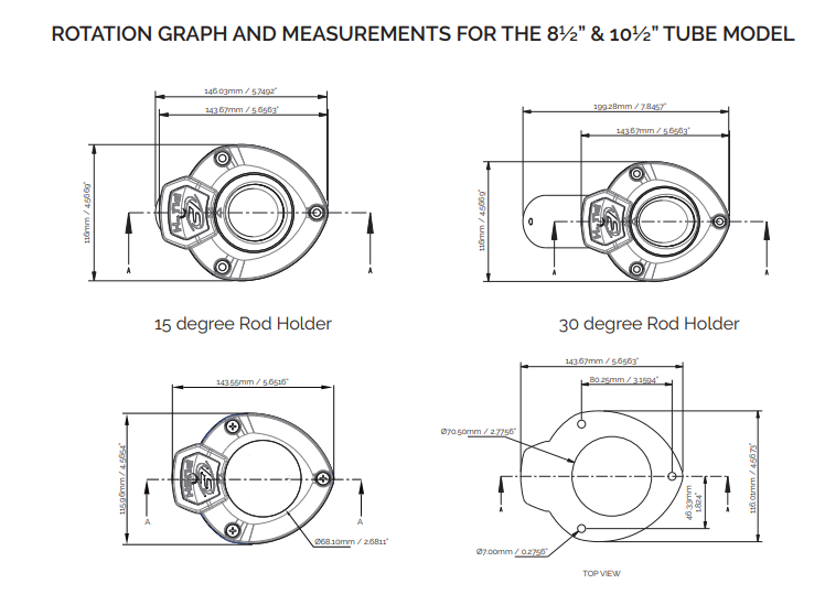 Rotating Measures 143mm / 5.6” long x 115mm / 4.5” wide, with an 8.5” deep tube. Installation comparable to typical flush mount rod holders – positioning will be determined by desired rotation of rod holder tube.