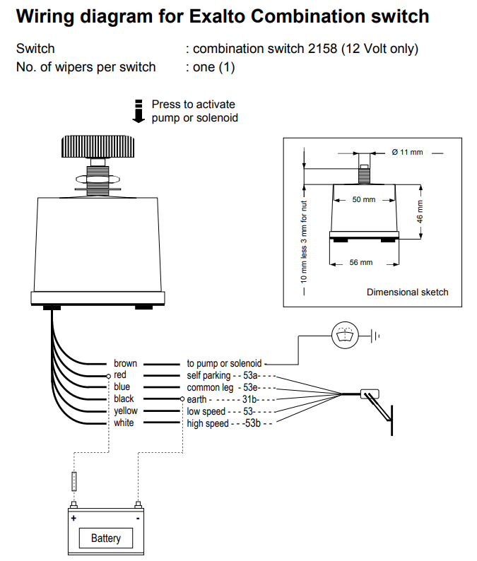This switch incorporates an adjustable intermittent wipe, two speeds and selfparking control, and has a separate connection for a pump or solenoid giving wash/wipe facility.