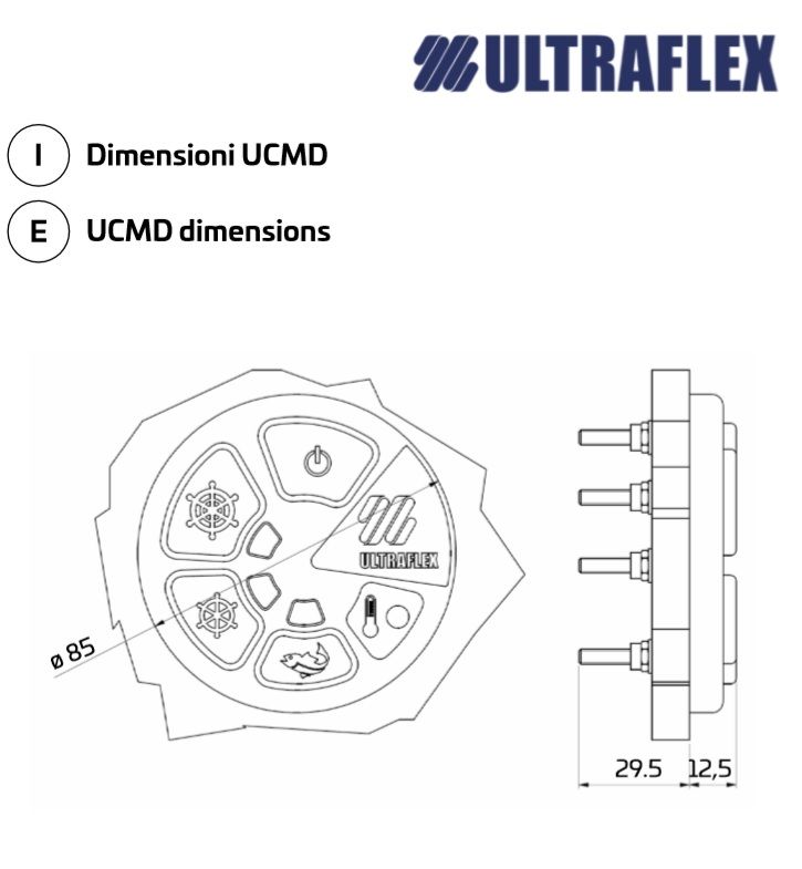 Ultraflex UCMD user interface. Safety switch ON/OFF (smart button). Three different power levels with light indicator. Motor temperature visual indicator. Twin engine key selection included. Lighted panel for stand-by position. Plug-in wiring harness. Suitable for a second station installation.