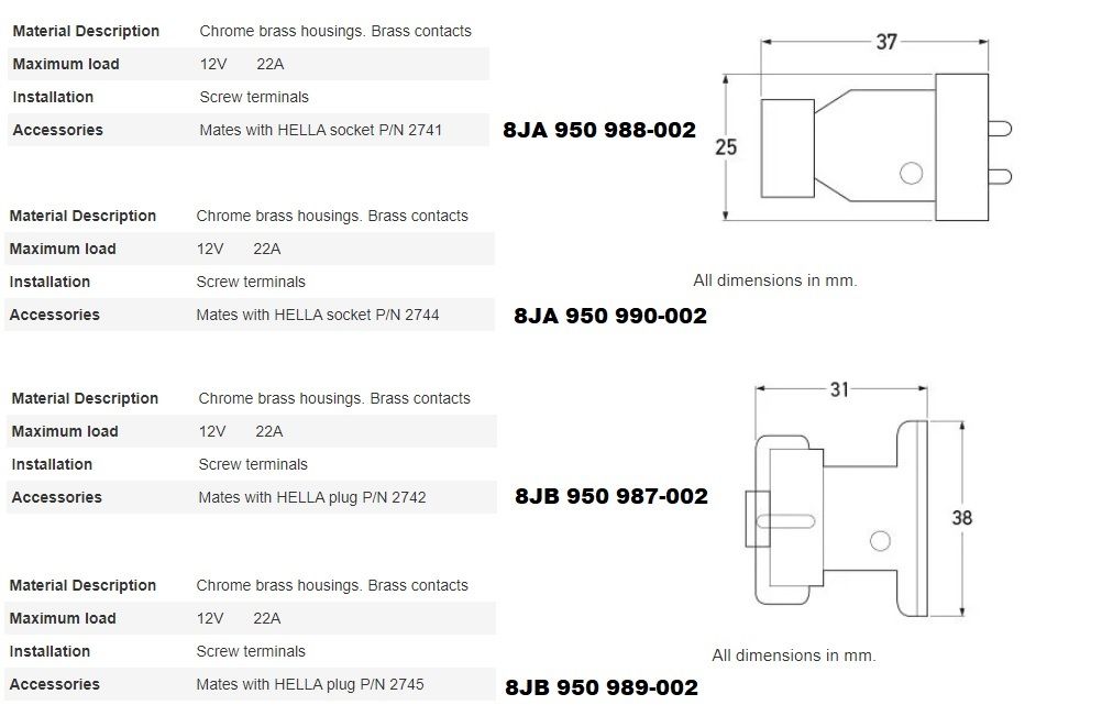 Hella marine water resistant chrome brass plugs and sockets for exterior or interior applications.